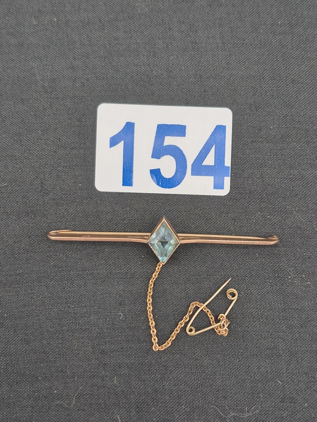 Lot 154 - 9ct gold Edwardian bar Broach with Light blue gem stone 3.7 grams SOLD £75 |
